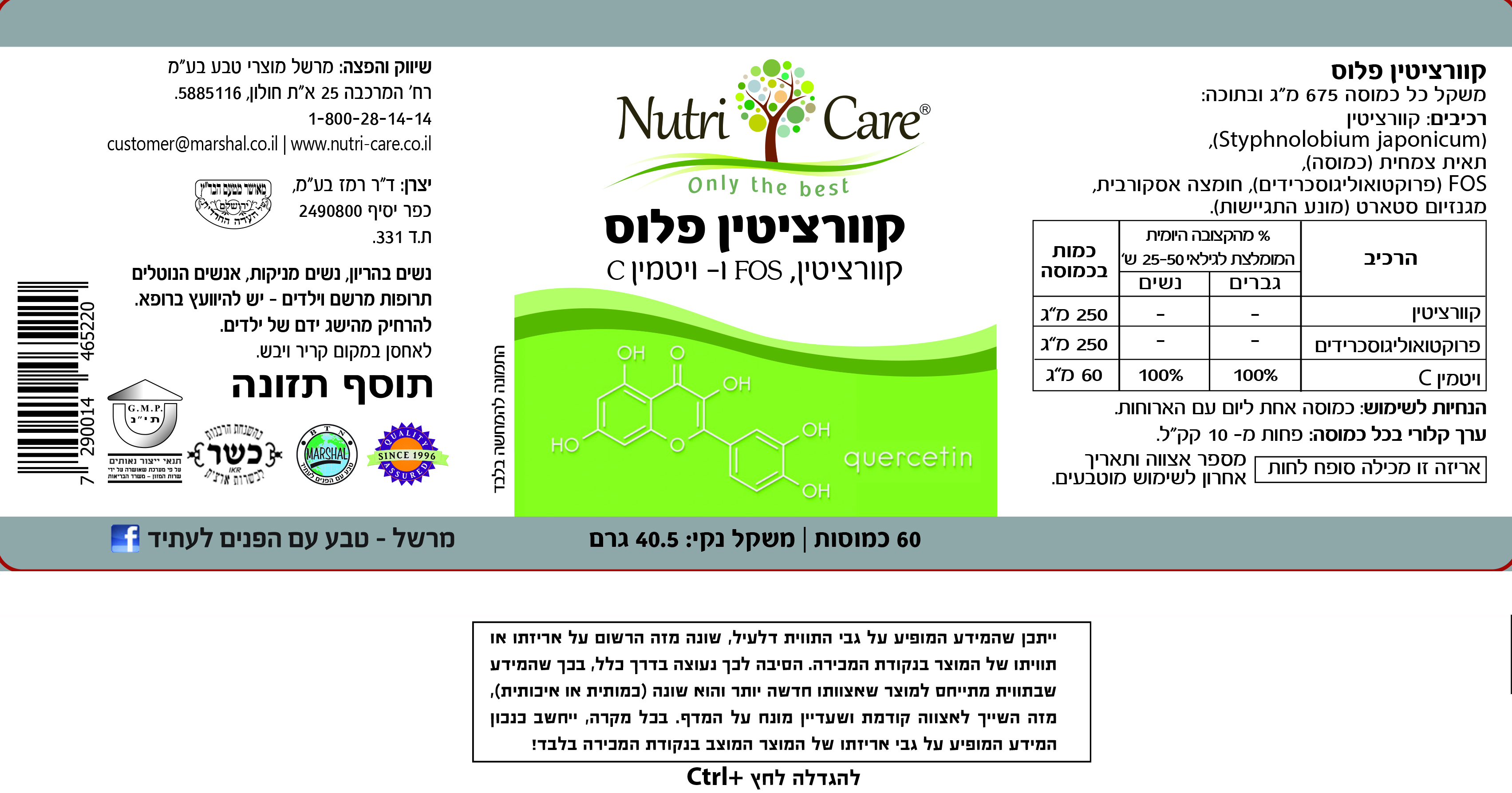 קוורציטין במינון של 250 מ"ג בתוספת 250 מ"ג  FOS ובתוספת 60 מ"ג ויטמין C.